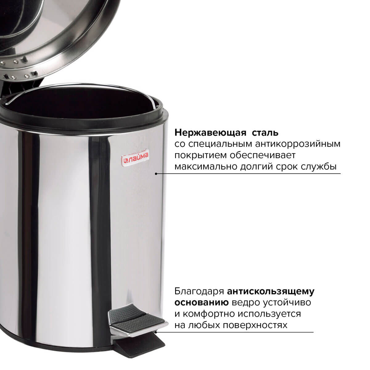 С вместимостью 3 литра, он идеально подходит для помещений с невысокой проходимостью. Педаль для открывания позволяет использовать его без рук, а плотно прилегающая крышка мгновенно устраняет неприятные запахи.